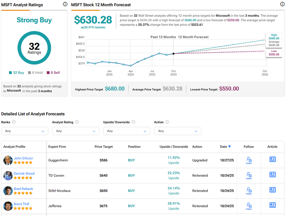 증권가는 마이크로소프트의 장기 전망에 대해 매우 낙관적인 입장을 유지하고 있다. 팁랭크스에서 MSFT 주식은 32개의 만장일치 매수 의견을 바탕으로 "적극 매수" 컨센서스 등급을 받고 있다. 평균 마이크로소프트 목표주가 630.28달러는 현재 수준에서 20.4%의 상승 여력을 시사한다. 연초 대비 MSFT 주식은 거의 25% 상승했다.