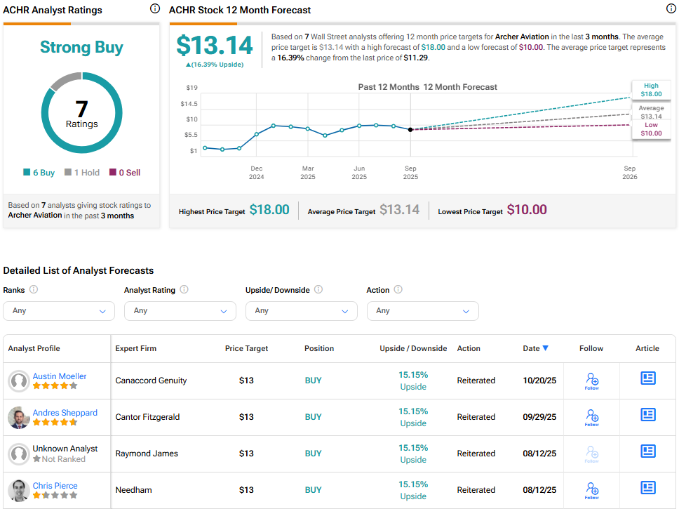 월가에서 증권가는 회사의 전망에 대해 낙관적인 입장을 유지하고 있다. 최근 7건의 평가를 기반으로 아처 에비에이션은 평균 12개월 목표주가 13.14달러로 "적극 매수" 의견을 받고 있다. 이는 현재 가격 대비 16.39%의 상승 여력을 시사한다.
