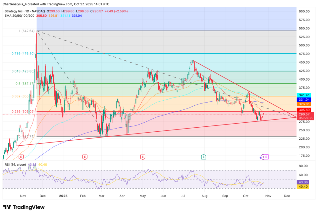 MSTR 주가는 일간 차트에서 하락 삼각형 패턴 내에서 움직이고 있다.