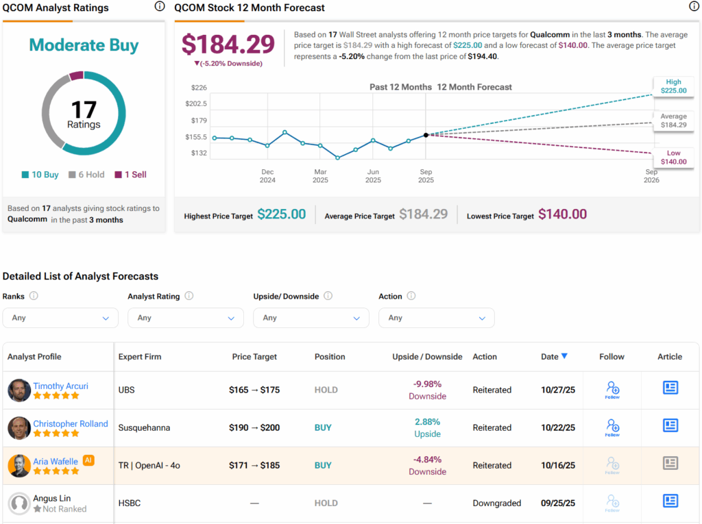 월가를 살펴보면, 애널리스트들은 QCOM 주식에 대해 보통 매수 의견을 제시하고 있다. 아래 그래픽에서 볼 수 있듯이 지난 3개월간 매수 10건, 보유 6건, 매도 1건의 의견이 나왔다. 또한 QCOM의 평균 목표주가는 주당 184.29달러로, 5.2%의 하락 여력을 시사한다.