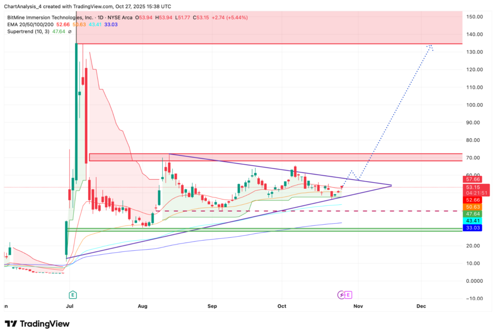 BMNR의 차트는 8월부터 지속된 대칭 삼각형 패턴의 정점에 근접하고 있다.