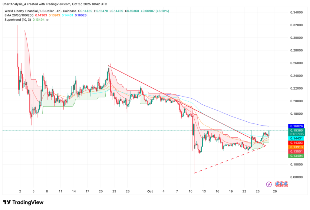 WLFI는 수주간 삼각형 패턴 내에서 통합장을 보이다가 현재 돌파 신호를 보이고 있다.