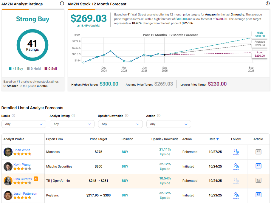 월가에서 AMZN 주식은 지난 3개월간 41개의 매수 의견을 받아 강력 매수 컨센서스 등급을 받고 있다. 269.03달러의 아마존 평균 목표주가는 18.52%의 상승 여력을 시사한다.