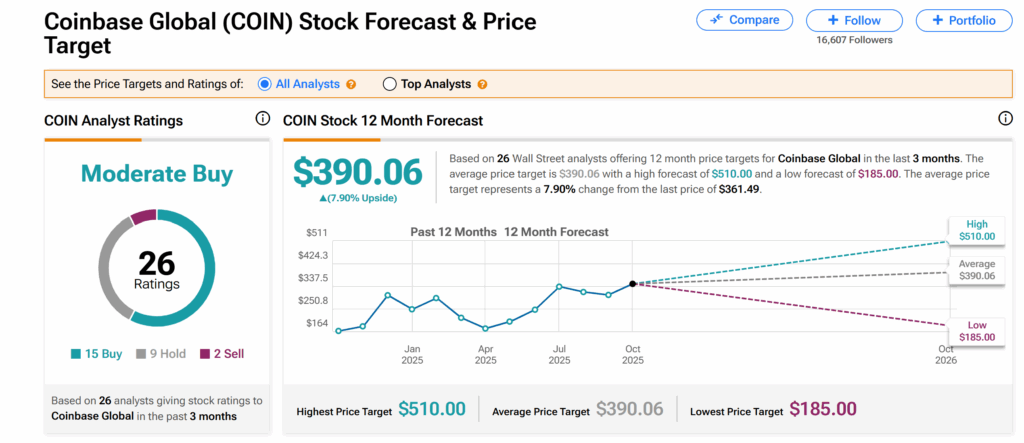 그러나 COIN의 평균 목표주가 390.06달러는 현재 수준에서 약 8% 상승 여력이 있음을 시사한다.