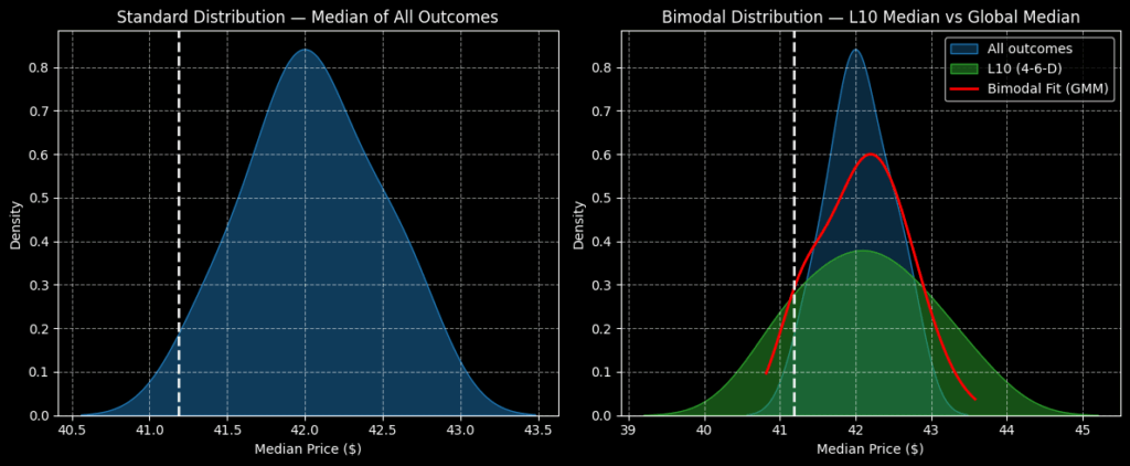 그러나 내가 주장하는 것은 우리가 기준 조건이 아니라 4-6-D 시퀀스 하에 있다는 것이다. 이 특정 프로필을 고려하면 향후 10주 동안 가격 군집이 42달러 부근에서 발생할 것으로 예상할 수 있다. 그러나 외부 분포 꼬리는 위험 측면에서 39달러, 보상 측면에서 45달러로 확장된다.