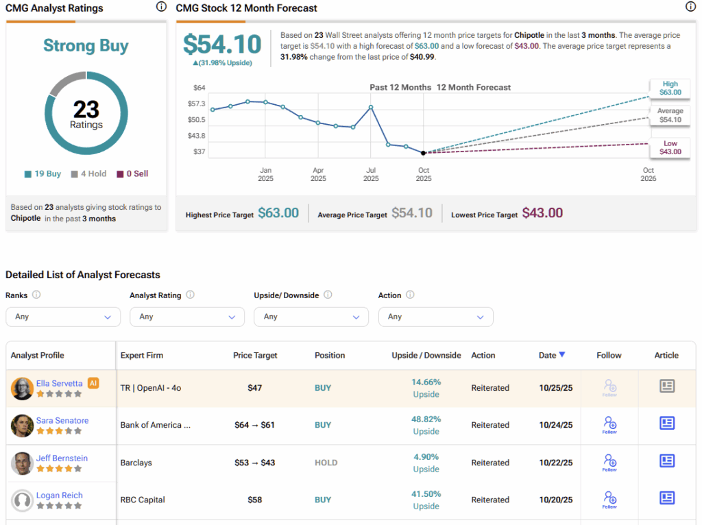 월가로 눈을 돌리면, CMG 주식은 지난 3개월 동안 얻은 19개의 매수, 4개의 보유, 0개의 매도 등급을 기반으로 강력 매수 컨센서스 등급을 받고 있다. 현재 CMG 주식의 평균 목표주가는 54.10달러로, 향후 12개월 동안 거의 32%의 상승 여력을 시사한다.