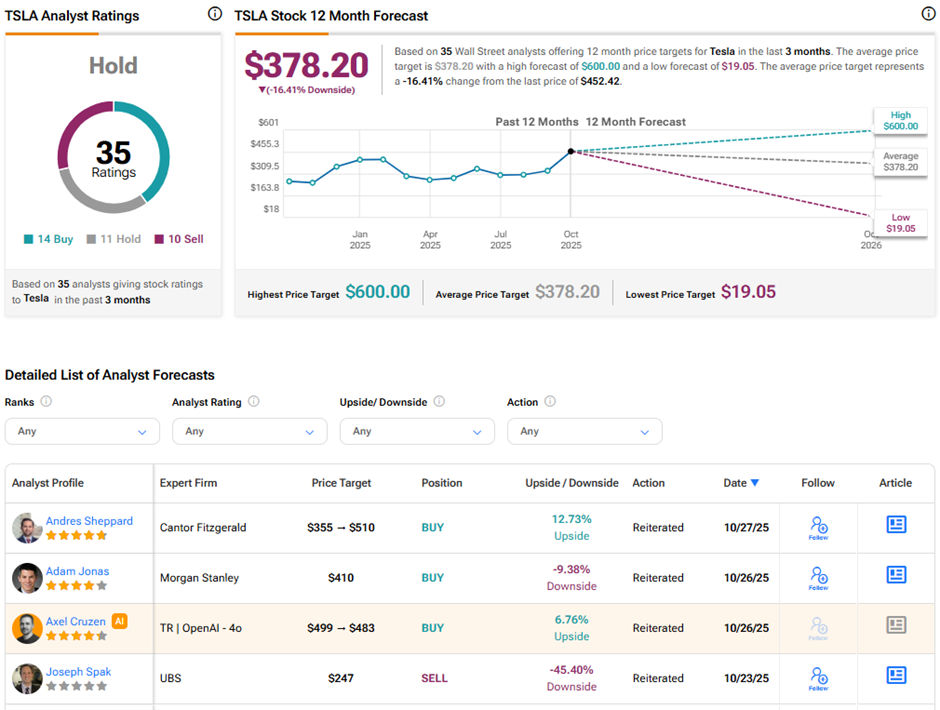 증권가는 테슬라의 장기 전망에 대해 의견이 엇갈린다. 팁랭크스에서 TSLA 주식은 14건의 매수, 11건의 보유, 10건의 매도 의견을 바탕으로 보유 컨센서스 등급을 받고 있다. 테슬라의 평균 목표주가 378.20달러는 현재 수준에서 16.4%의 하락 여력을 시사한다. 연초 이후 TSLA 주가는 12% 상승했다.