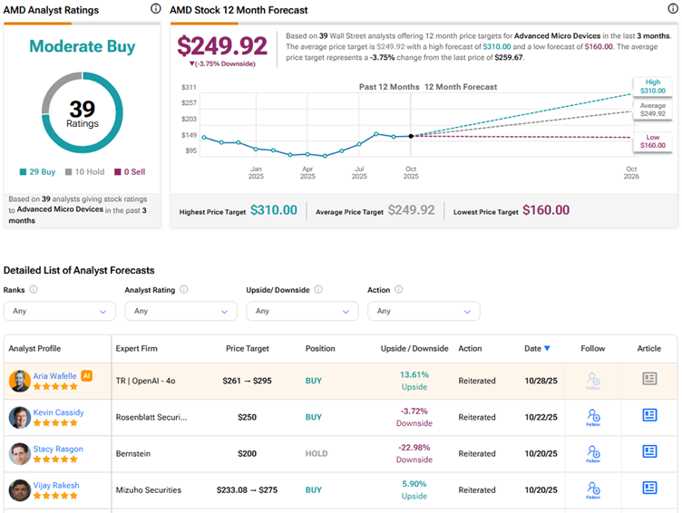 현재 월가는 어드밴스드 마이크로 디바이시스 주식에 대해 29건의 매수와 10건의 보유 의견을 바탕으로 중립적 매수 컨센서스 등급을 부여하고 있다. AMD 주가 목표가 평균인 249.92달러는 현재 수준에서 3.8%의 하락 가능성을 시사한다.