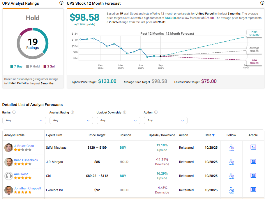 월가에서 UPS 주식은 최근 3개월간 매수 7건, 보유 9건, 매도 3건의 의견을 받아 보유 컨센서스 등급을 기록하고 있다. 평균 유나이티드 파셀 목표주가는 98.58달러로 3.08%의 상승 여력을 시사한다.