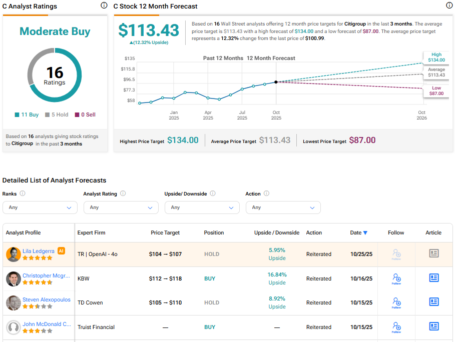 증권가에서 씨티그룹은 16명의 애널리스트 평가를 기반으로 보통 매수 컨센서스 등급을 받고 있다. 평균 C 목표주가는 113.43달러로, 현재 가격 대비 12.32% 상승 여력을 시사한다.