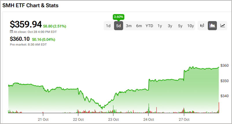 SMH ETF는 어떻게 움직이고 있을까? VanEck 반도체 ETF는 지난 5일간 3.6% 상승했으며, 연초 대비 약 49% 상승세를 유지하고 있다.
