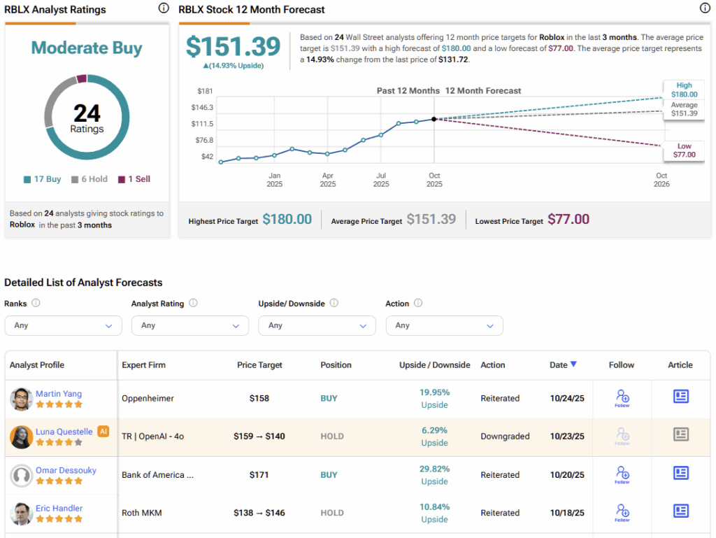 팁랭크스에 따르면, 로블록스는 24명의 애널리스트 리뷰를 기반으로 매수 17건, 보유 6건, 매도 1건을 포함해 보통 매수 컨센서스 등급을 받고 있다. 평균 목표주가는 151.39달러로, 향후 1년간 거의 15%의 상승 여력을 시사한다.
