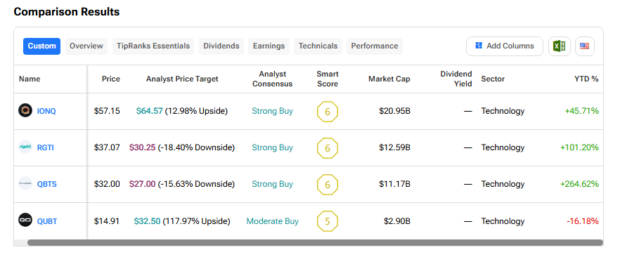 4개 양자컴퓨팅 주식 중 아이온큐, 리게티 컴퓨팅, 디웨이브 퀀텀 3종목은 월가로부터 "적극 매수" 의견을 받았고, 퀀텀 컴퓨팅은 "보통 매수" 등급을 받았다. 이 중 아이온큐가 향후 12개월간 가장 높은 상승 여력을 보인다.