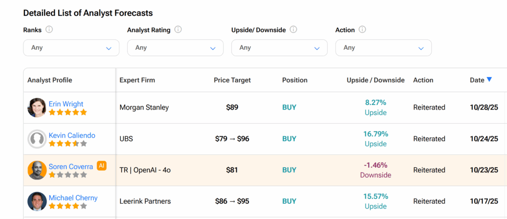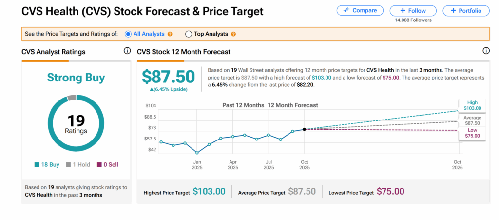 월가에서 CVS 헬스 주식은 팁랭크스에 따르면 현재 애널리스트들로부터 매수 강력 추천 등급을 받고 있다. 이는 지난 3개월 동안 애널리스트들이 부여한 18개의 매수와 1개의 보유 의견을 기반으로 한다.