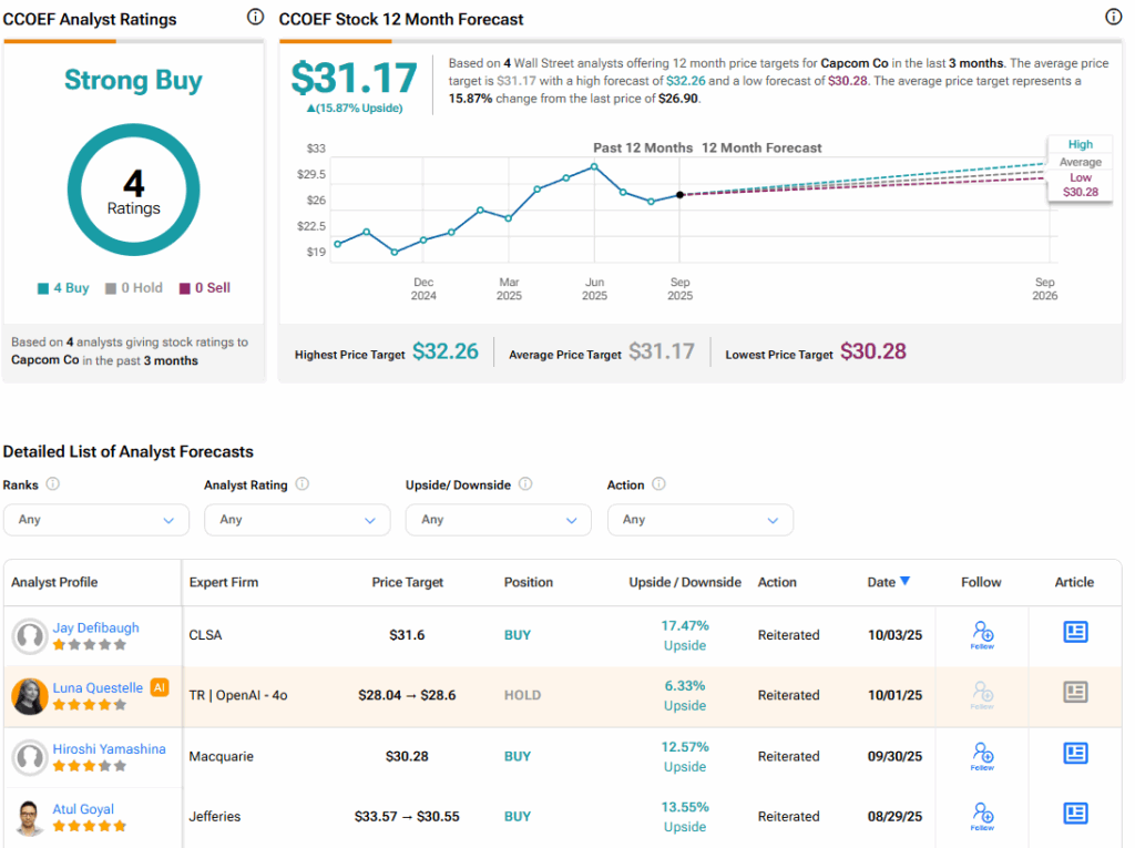 월가로 눈을 돌리면, 지난 3개월간 4건의 매수 의견을 바탕으로 한 캡콤에 대한 증권가의 컨센서스 등급은 적극 매수다. 이와 함께 CCOEF 주식의 평균 목표주가는 31.17달러로, 주가의 잠재적 상승 여력은 15.87%다. 이러한 등급과 목표주가는 애널리스트들이 오늘 실적 보고서 이후 커버리지를 업데이트하면서 변경될 가능성이 크다.