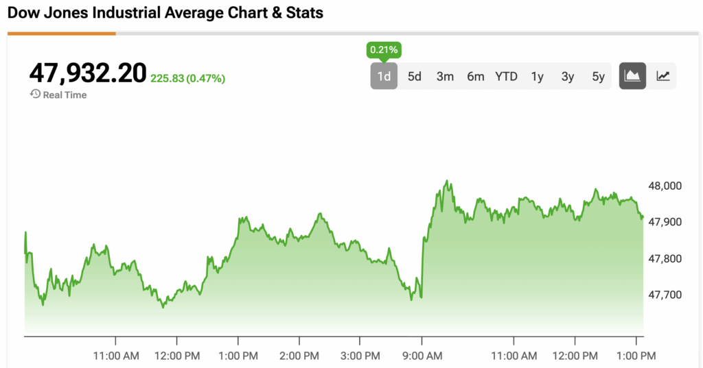 다우존스는 이 글을 쓰는 시점에 0.47% 상승했다.