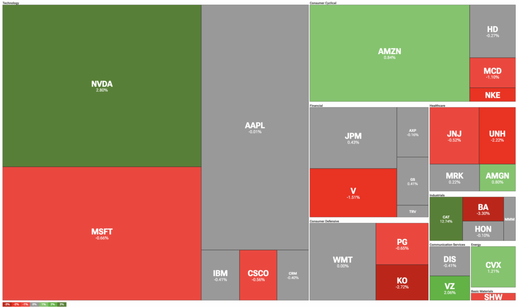 팁랭크스의 다우존스 히트맵으로 전환해 지수의 가격 움직임에 기여한 종목들을 살펴보자.