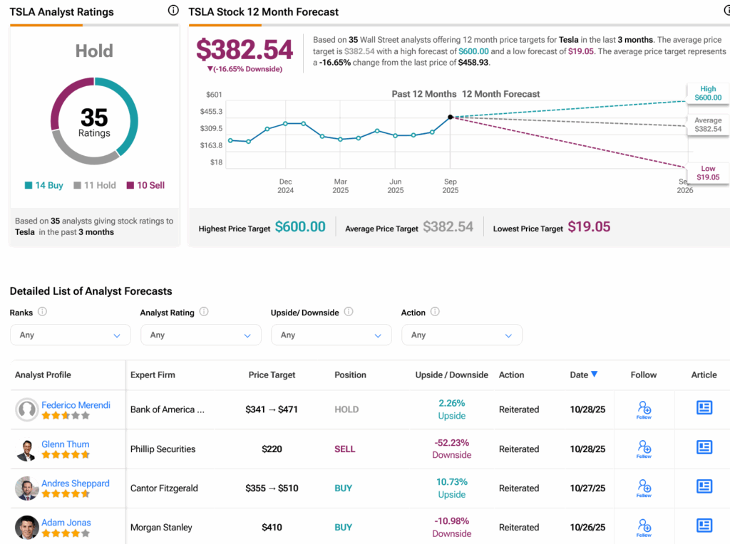 월가에서 애널리스트들은 지난 3개월간 매수 14건, 보유 11건, 매도 10건을 부여하여 TSLA 주식에 대해 보유 컨센서스 등급을 제시하고 있다. 지난 1년간 주가가 68.52% 상승한 후, 평균 TSLA 목표주가는 주당 382.54달러로 16.65%의 하락 여력을 시사한다.