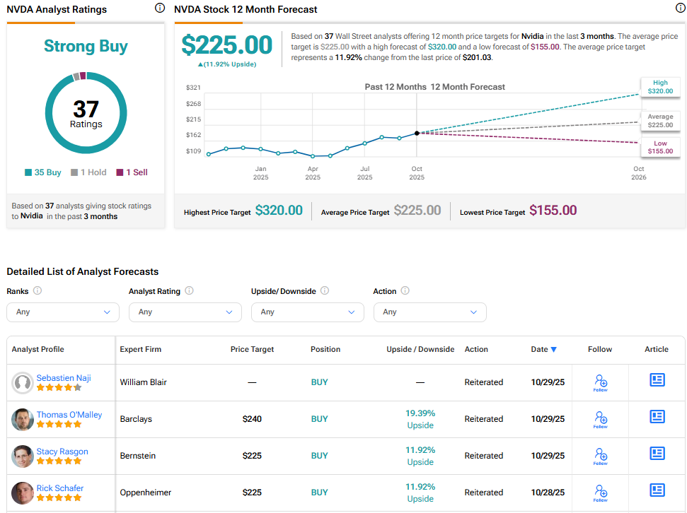 엔비디아는 강력 매수 컨센서스 등급으로 증권가의 지지를 계속 받고 있다. NVDA 평균 목표주가는 225달러로, 현재 가격 대비 11.92% 상승 여력을 시사한다.