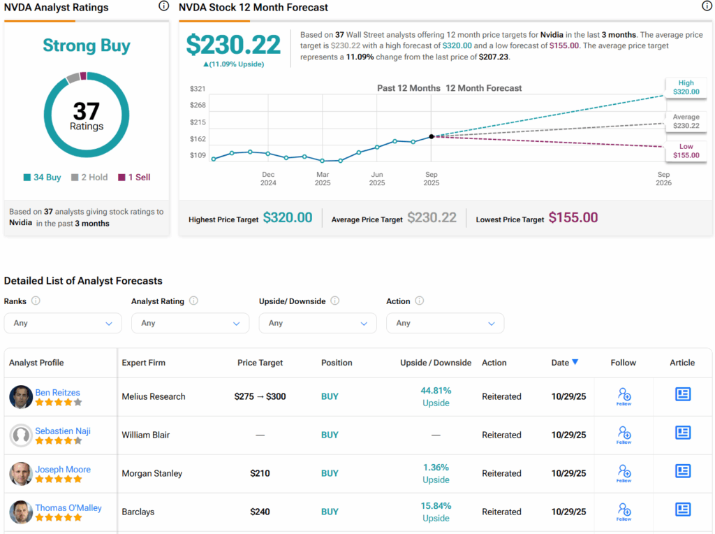 월가에서 애널리스트들은 지난 3개월간 34건의 매수, 2건의 보유, 1건의 매도 의견을 제시하며 엔비디아 주식에 대해 강력 매수 컨센서스 등급을 부여했다. 또한 엔비디아 평균 목표주가는 주당 230.22달러로 11.1%의 상승 여력을 시사한다.