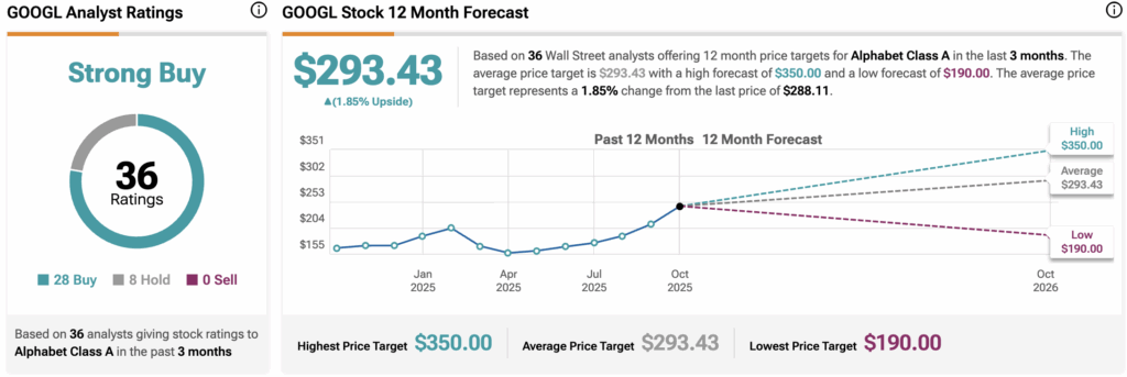 알파벳은 36명의 애널리스트 평가를 기반으로 매수 강력 추천 의견을 받고 있으며, 매수 28건, 보유 8건, 매도 0건으로 구성돼 있다. 12개월 평균 GOOGL 목표주가는 293.43달러로 최근 종가 대비 1.85%의 소폭 상승 여력을 시사한다.