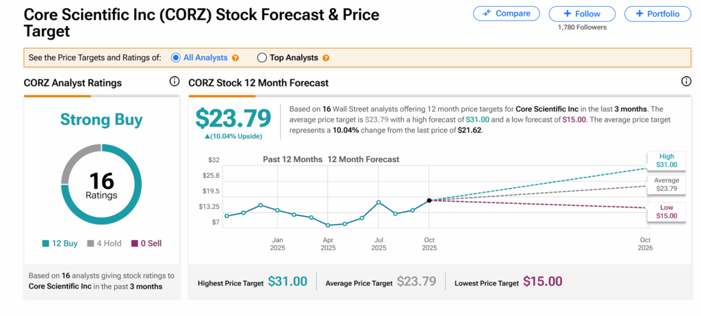 또한 평균 CORZ 목표주가 23.79달러는 현재 수준에서 10% 상승 여력을 시사한다.