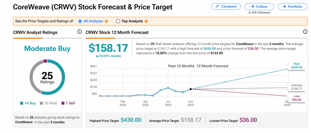 그러나 평균 CRWV 목표주가는 158.17달러로, 현재 수준에서 약 18%의 상승 여력을 시사한다.