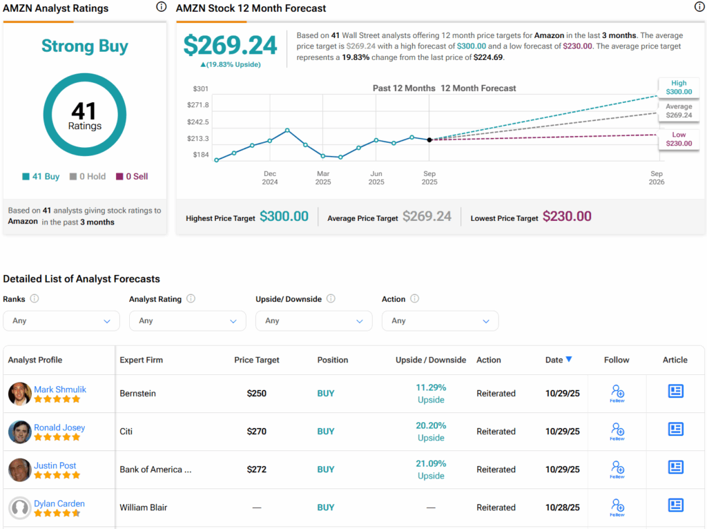 월가 증권가는 아래 그래픽에서 볼 수 있듯이 지난 3개월간 41건의 매수 의견을 바탕으로 AMZN 주식에 대해 강력 매수 컨센서스 등급을 부여하고 있다. 또한 AMZN 평균 목표주가는 주당 269.24달러로 19.8%의 상승 여력을 시사한다. 다만 오늘 실적 발표 이후 전망치가 변경될 가능성이 있다는 점은 주목할 만하다.