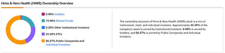 팁랭크스의 지분 분석 도구에 따르면, 공개 기업과 개인 투자자들이 56.57%로 HIMS의 최대 지분을 보유하고 있다. 그 뒤를 ETF, 뮤추얼펀드, 내부자, 기타 기관투자자들이 각각 22.2%, 19.96%, 0.98%, 0.28%로 따르고 있다.