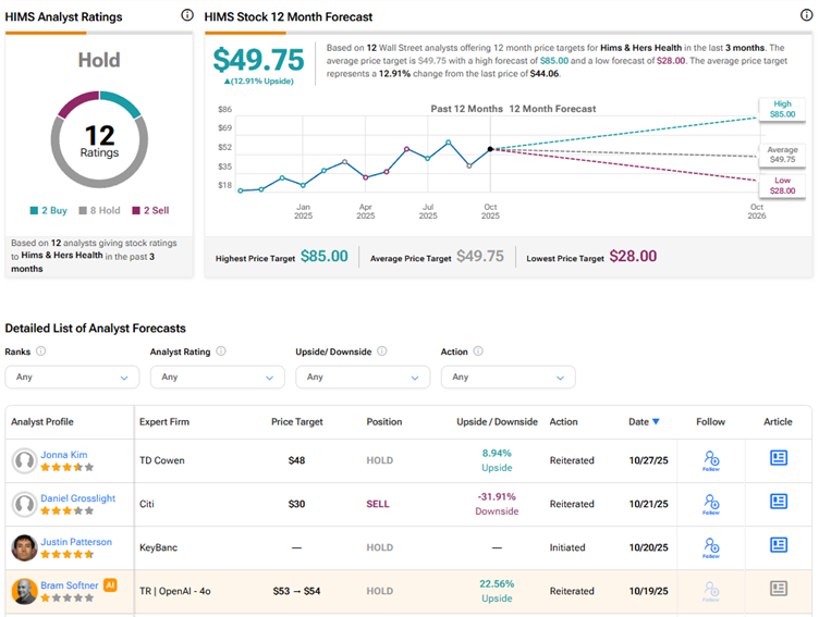 3분기 실적 발표를 앞두고 월가는 힘스 앤 허스 헬스 주식에 대해 보유 의견 8개, 매수 의견 2개, 매도 의견 2개를 바탕으로 보유 컨센서스 등급을 부여하고 있다. HIMS 주식의 평균 목표주가는 49.75달러로 약 13%의 상승 여력을 시사한다.