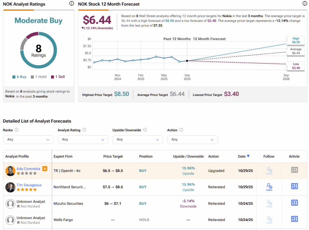 월가 애널리스트 8명의 평가를 기반으로 한 노키아 평균 목표주가는 6.44달러로, 현재 시장 가격 대비 12% 하락 여력을 시사한다.