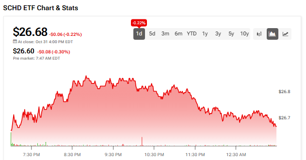 SCHD 주식은 어떻게 움직이고 있을까? 슈왑 미국 배당주 ETF (SCHD)는 오늘 프리마켓 거래에서 0.30% 하락했다. 이 ETF는 목요일에도 0.22% 하락한 26.68달러를 기록했는데, 투자자들이 배당 중심 펀드에서 자금을 빼내 성장주와 기술주로 이동했기 때문이다.