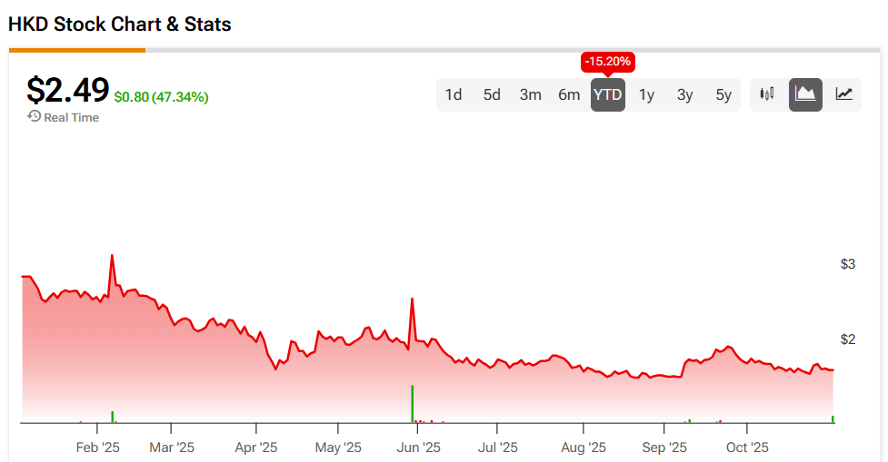 AMTD 디지털 주식은 금요일 47.43% 상승했지만 연초 대비로는 여전히 15.2% 하락한 상태다. 또한 지난 12개월간 45.48% 하락했다.
