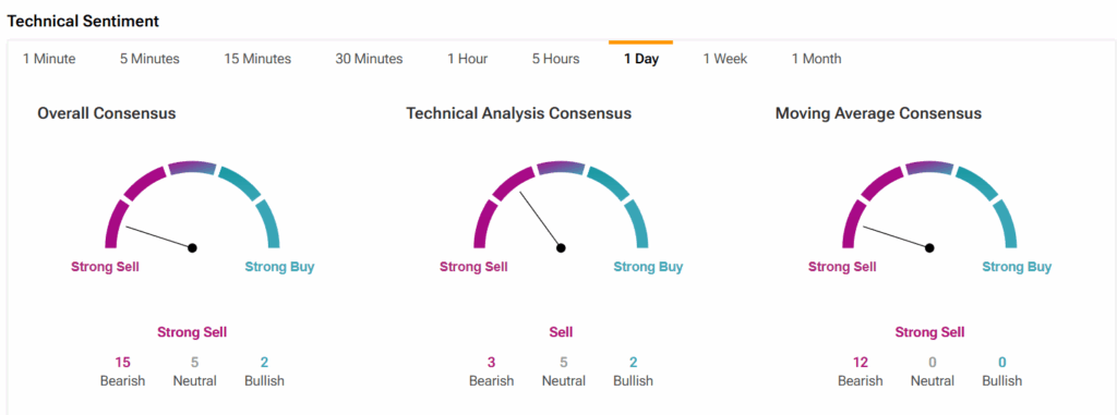 월가에서는 AMTD 디지털에 대한 애널리스트 커버리지가 부족한 상황이다. 대신 팁랭크스 기술적 센티먼트를 살펴보자. 전체 컨센서스는 적극 매도, 기술적 분석 컨센서스는 매도, 이동평균 컨센서스는 적극 매도로 나타났다.