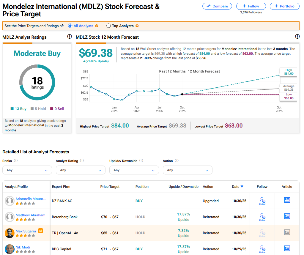 팁랭크스에서 MDLZ는 매수 13개와 보유 5개 의견을 바탕으로 적극 매수 컨센서스를 받고 있다. 최고 목표주가는 84달러다. MDLZ 주식의 컨센서스 목표주가는 69.38달러로 21.80%의 상승 여력을 시사한다.