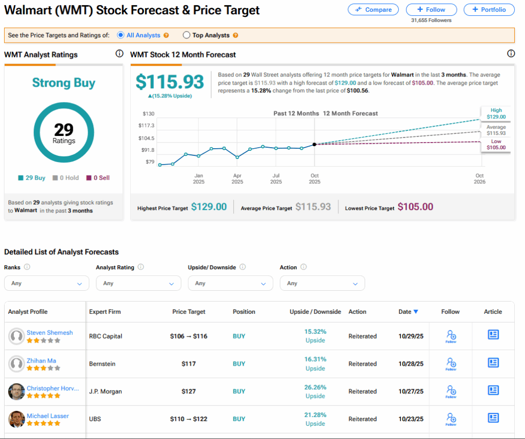 팁랭크스에서 WMT는 29개의 매수 등급을 기반으로 강력 매수 컨센서스를 받고 있다. 최고 목표주가는 129달러다. WMT 주식의 컨센서스 목표주가는 115.93달러로, 15.28%의 상승 여력을 시사한다.