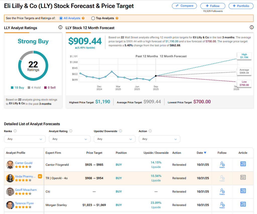 일라이 릴리 주식은 월가 애널리스트 22명으로부터 적극 매수 의견을 받고 있다. 이 의견은 최근 3개월간 발표된 매수 18건과 보유 4건을 기반으로 한다. 평균 LLY 목표주가는 909.44달러로 현재 수준 대비 5.40% 상승 여력을 시사한다.