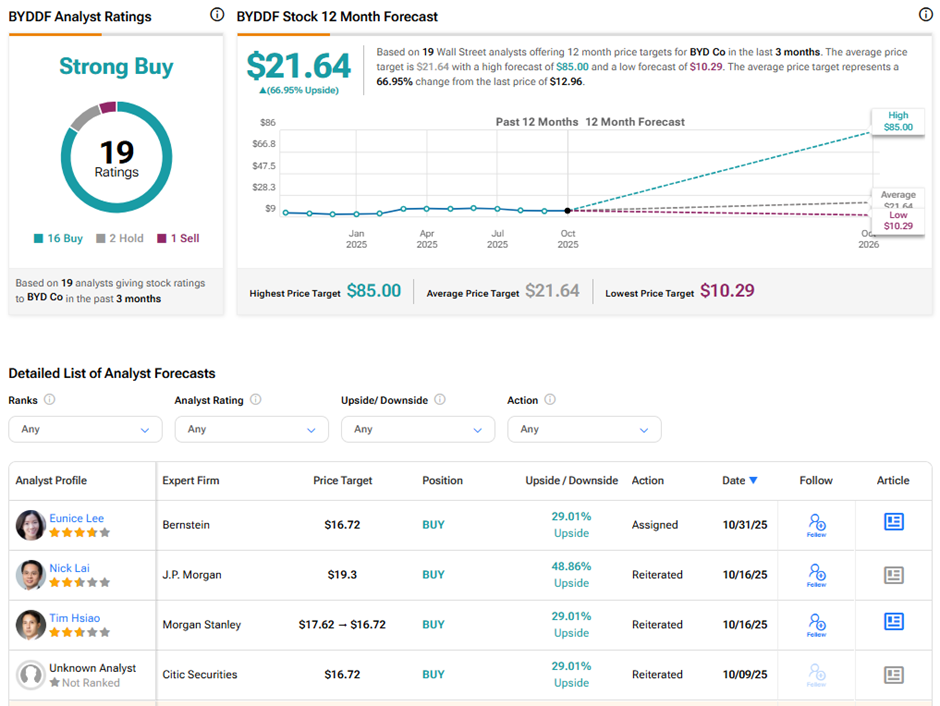 증권가는 BYD의 장기 전망에 대해 낙관적인 입장을 유지하고 있다. 팁랭크스에서 BYDDF 주식은 16개의 매수, 2개의 보유, 1개의 매도 의견을 바탕으로 강력한 매수 컨센서스 등급을 받고 있다. 평균 BYD 목표주가 21.64달러는 현재 수준에서 거의 67%의 상승 여력을 시사한다.