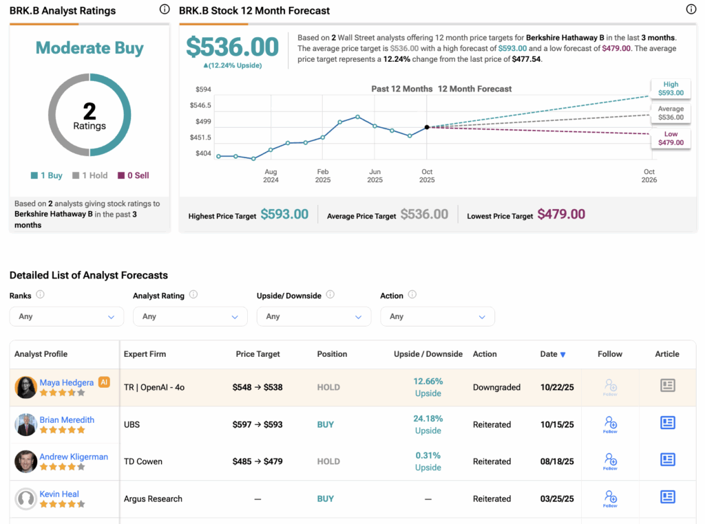 버크셔 해서웨이 클래스 B 주식은 현재 지난 3개월간 발표된 매수 의견 1건과 보유 의견 1건을 바탕으로 적극 매수 등급을 받고 있다. BRK.B의 평균 목표주가는 536달러로 현재 수준 대비 12.24%의 상승 여력을 시사한다.