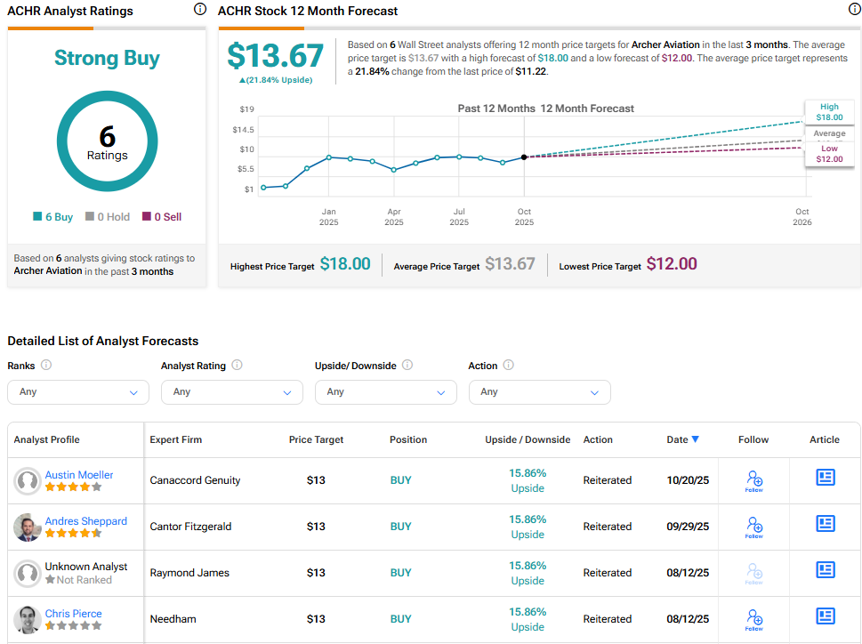 증권가에서는 회사의 전망에 대해 낙관적인 입장을 유지하고 있다. 최근 6개의 평가를 기준으로 아처 에비에이션은 평균 12개월 목표주가 13.67달러로 "적극 매수" 의견을 받고 있다. 이는 현재 주가 대비 21.84%의 상승 여력을 의미한다.