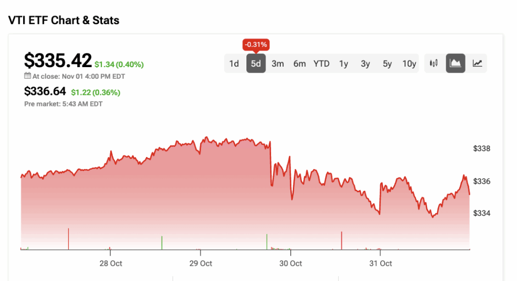 VTI ETF는 금요일 0.40% 상승했다. 마찬가지로 나스닥 종합지수는 0.60%, S&P 500 지수는 0.3% 올랐다. 미국 주식 시장 지수들은 금요일 거대 기술기업 아마존(AMZN)의 강력한 분기 실적 이후 급등했다.