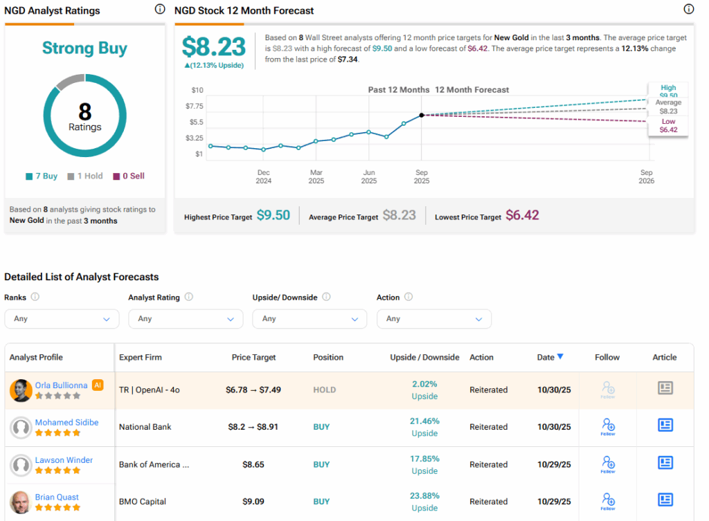 월가로 눈을 돌리면, 뉴골드에 대한 증권가의 컨센서스 등급은 적극 매수다. 지난 3개월간 매수 7건, 보유 1건을 기록했다. 이와 함께 NGD 주식의 평균 목표주가는 8.23달러로, 주가의 잠재적 상승 여력은 12.13%다.