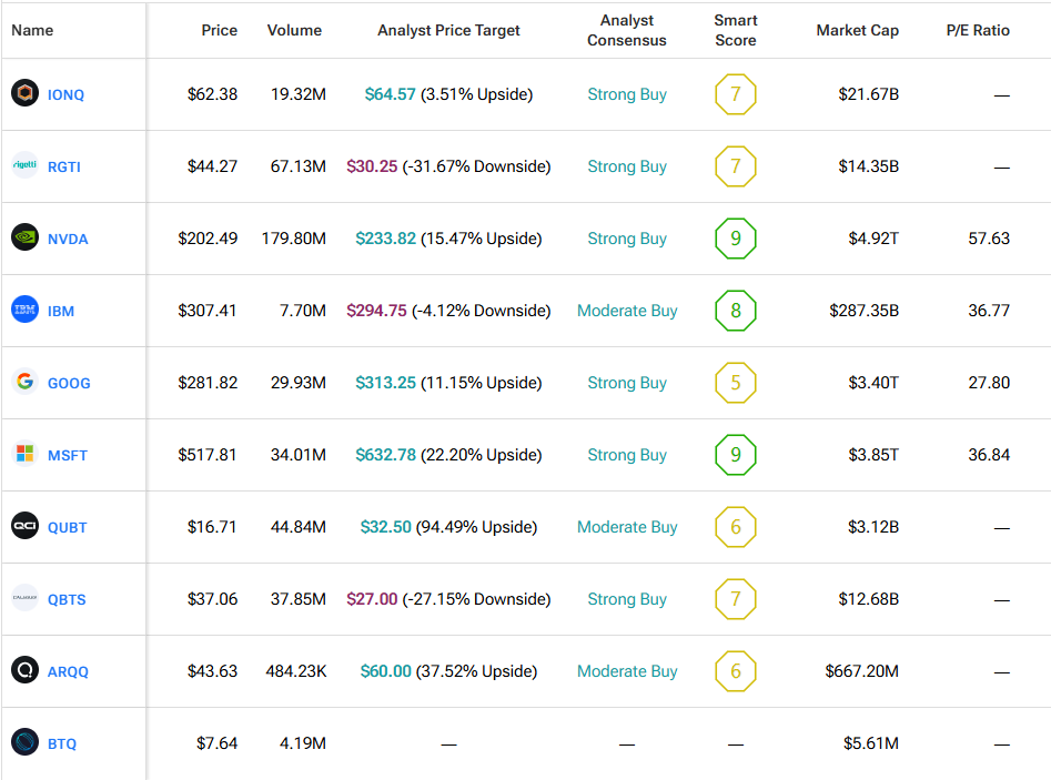 우리는 팁랭크스의 비교 도구를 사용하여 주요 양자 컴퓨팅 주식들을 정리했습니다. 이들이 어떻게 비교되는지, 그리고 이 분야가 어디로 향할 수 있는지 빠르게 확인할 수 있는 방법입니다.