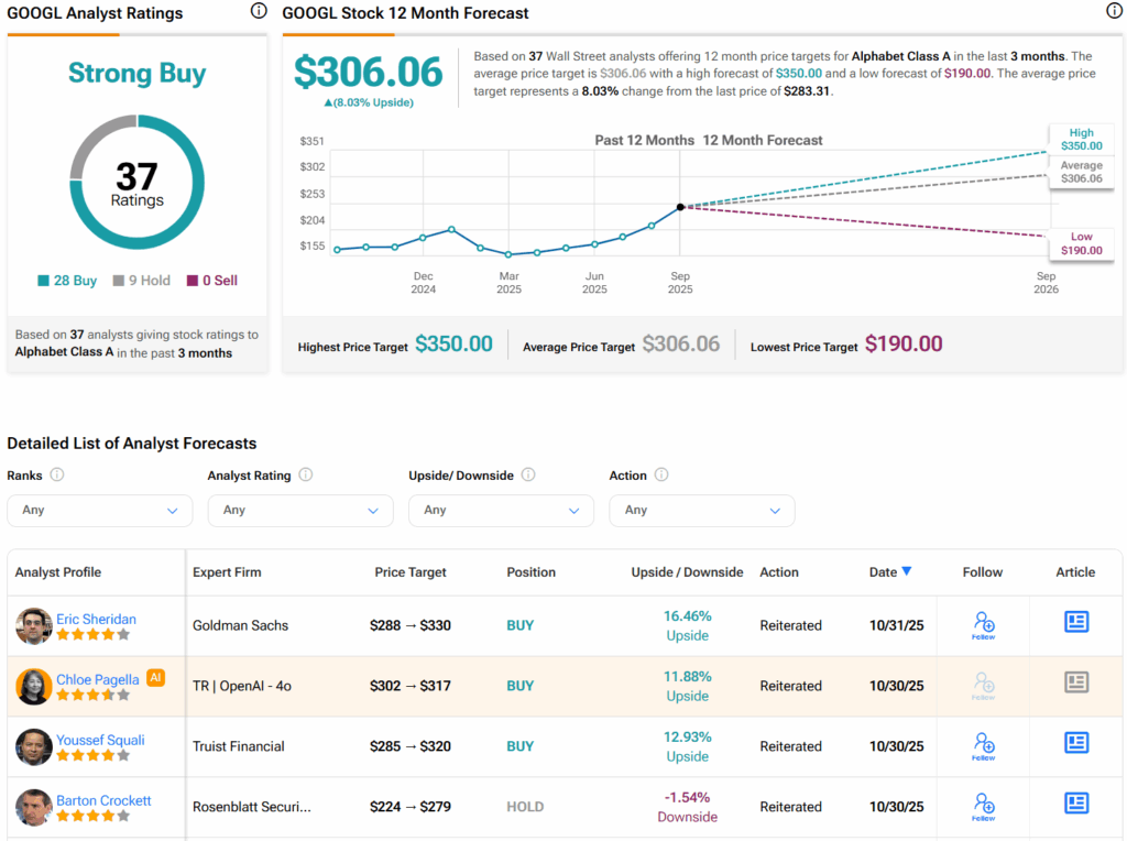 월가에서는 지난 3개월간 28건의 매수와 9건의 보유 의견을 바탕으로 GOOGL 주식에 대해 강력 매수 컨센서스 등급을 부여하고 있다. 또한 GOOGL의 평균 목표주가는 주당 306.06달러로 8%의 상승 여력을 시사한다.