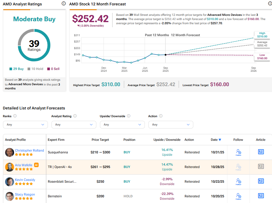 월가로 눈을 돌리면, AMD 주식은 최근 3개월간 29건의 매수와 10건의 보유 의견을 받아 보통 매수 컨센서스 등급을 기록하고 있다. AMD의 평균 목표주가는 252.42달러로 2.05%의 하락 여력을 시사한다.