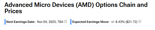 어드밴스드 마이크로 디바이시스 (AMD)가 11월 4일 화요일 장 마감 후 3분기 실적을 발표할 예정이다. 실적 발표 후 옵션 시장은 양방향으로 8.41%의 변동성을 예상하고 있다. 이는 AMD의 장기 평균 실적 발표 후 변동률인 -1.94%보다 훨씬 높은 수치로, 이 반도체 제조업체가 AI 사업을 가속화하면서 투자자들의 기대와 불확실성이 높아졌음을 시사한다.