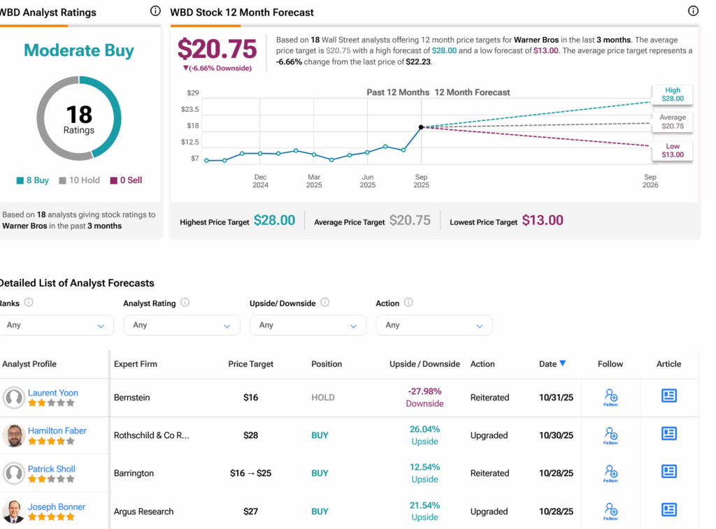 월가를 살펴보면, 애널리스트들은 WBD 주식에 대해 최근 3개월간 8건의 매수와 10건의 보유 의견을 제시하며 보통 매수 컨센서스 등급을 부여했다. 지난 1년간 주가가 174.79% 상승한 후, 평균 WBD 목표주가는 주당 20.75달러로 6.66%의 하락 여력을 시사한다.