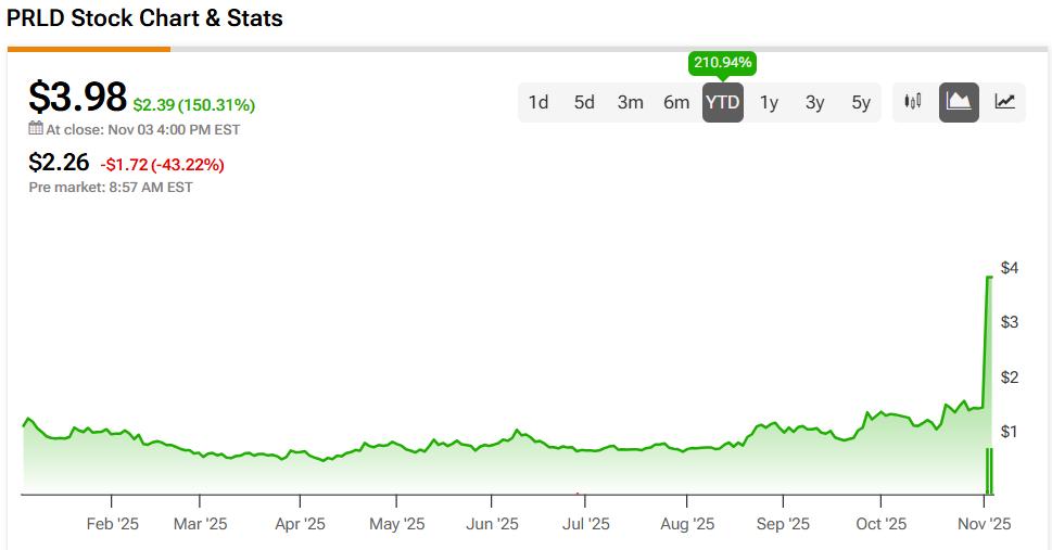 오늘 뉴스로 PRLD 주식에 대규모 거래가 발생했으며, 약 1,000만 주가 거래됐다. 참고로 이 회사의 3개월 일평균 거래량은 약 25만 6,000주다. 전날 거래량도 3,457만 주로 높은 수준을 기록했다.