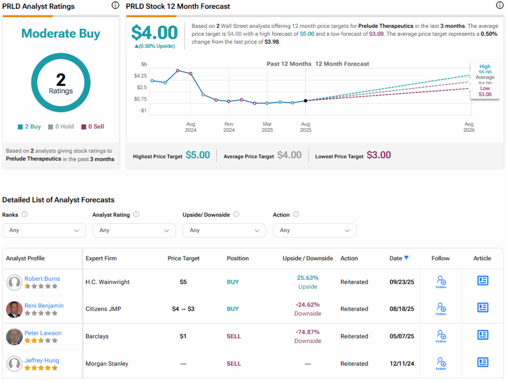 월가를 살펴보면, 프렐류드 테라퓨틱스에 대한 증권가의 컨센서스 등급은 '적극 매수'다. 이는 지난 3개월간 2건의 매수 의견을 기반으로 한다. 이와 함께 PRLD 주식의 평균 목표주가는 4달러로, 주가 상승 여력은 0.5%다.