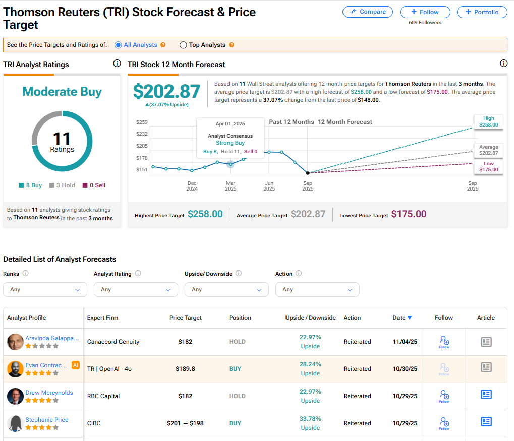 톰슨 로이터 주식은 11명의 월가 애널리스트들 사이에서 보통 매수 등급 컨센서스를 받고 있다. 이 등급은 지난 3개월간 발표된 8건의 매수와 3건의 보유 의견을 기반으로 한다. 평균 TRI 목표주가 202.87달러는 현재 수준 대비 37.07% 상승 여력을 시사한다. 이러한 등급들은 회사의 실적 발표 이후 변경될 수 있다.
